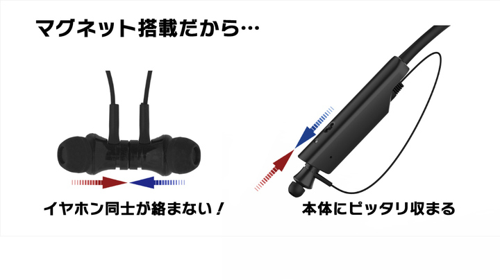 左右のイヤホン同士がぴたりとくっつく仕様なので、イヤホン同士が絡まったりケーブルが絡まりあうことがありません。